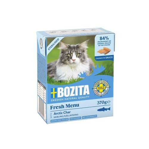 Bozita Sterilised Artic Char on tasakaalustatud täissööt täiskasvanud kassidele. Toit on kohandatud steriliseeritud kassidele, kelle energiavajadus on väiksem, mistõttu sobib see ka vanematele ja ülekaalulistele kassidele. Kõrge lihasisaldus (kuni 84%) ja värske tooraine tagavad madala rasvasisalduse, mille tulemuseks on loomulikult tasakaalustatud vitamiinide ja mineraalainete tase. Retsept on teraviljavaba ja ei sisalda lisatud suhkruid ega värvaineid ning on rikastatud tervist edendavate omadustega looduslike pärmi beeta-glükaanidega.